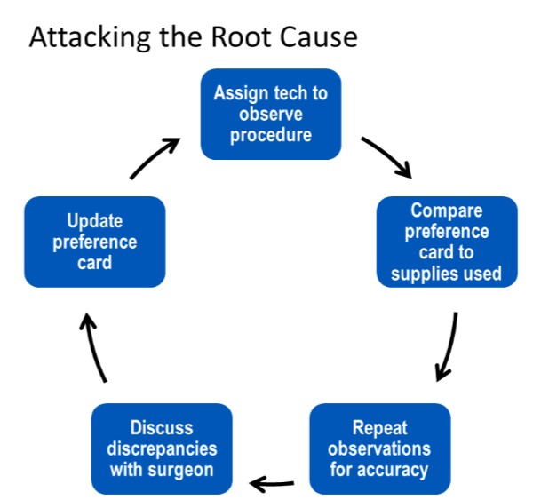 With these data in hand, the techs can have a fact-based discussion with each doctor to illustrate the disparity between his actual supply use across the five observed surgeries and what’s on his preference card. This includes pointing out items on the card the doctor used and frequency of use (e.g., 100 percent, 80 percent and 50 percent of the time); those on the card he never used; and those he used (and how frequently) but weren’t on the card—i.e., the ones the nurse had to rush out to retrieve in the middle of surgery.